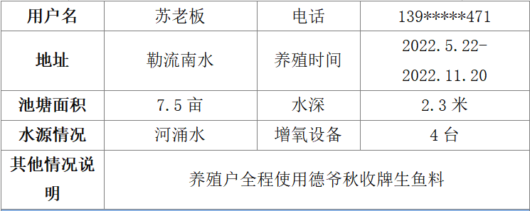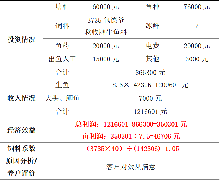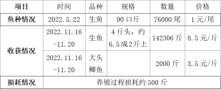蘇老板在順德勒流有一口池塘,水面積7.5畝,2022年5月22日投入76000尾規(guī)格為90口/斤的生魚苗進(jìn)塘養(yǎng)殖,全程使用德爺秋收牌生魚飼料投喂。經(jīng)過半年的養(yǎng)殖之后,在11月16日開始出魚,11月20日干塘,共產(chǎn)出生魚142306斤,賣價8.5元/斤,獲利35031元,畝賺46706元,料比僅1.05!