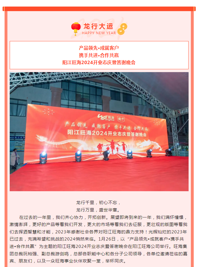 產(chǎn)品領(lǐng)先·成就客戶·攜手共進·合作共贏—陽江旺海2024開業(yè)志慶暨答謝晚會